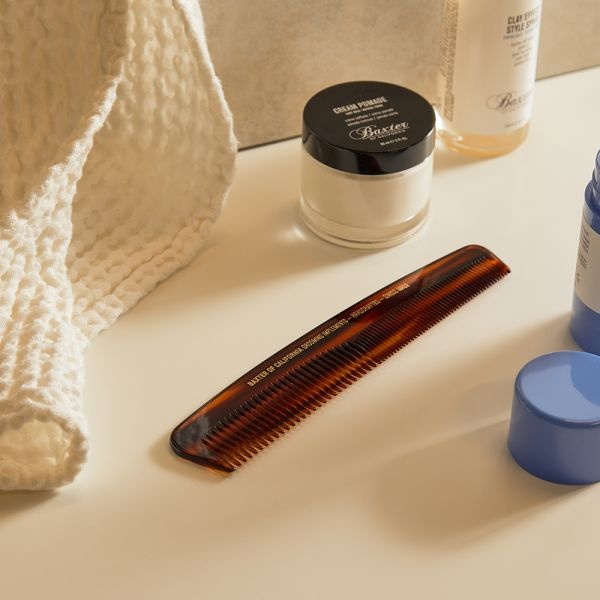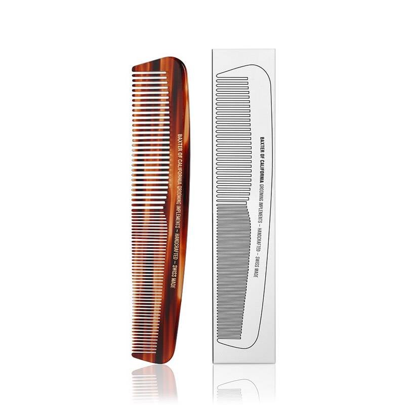 Grote kam van Baxter of Callifornia van imitatie schildpadschild. Lengte: 20cm. Handgemaakt in Zwitserland. De kammen van Baxter worden gemaakt van hoge kwaliteit cellulose acetaat in 12 handmatig uitgevoerde stappen. De taps toelopende en afgeronde tanden van de kam garanderen een comfortabele verzorging van de hoofdharen zonder de hoofdhuid te beschadigen. Kam heeft zowel grove als fijne tanden.