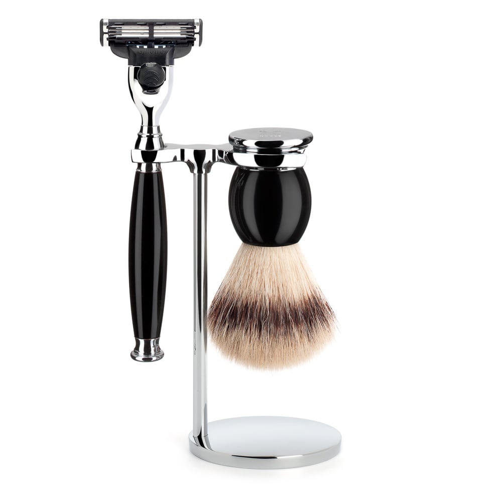 3-teiliges Rasierset aus der Sophist Serie von MÜHLE. Dieses Set besteht aus einem Rasierpinsel mit Silvertip Fibre®, einem Gillette Mach3® Rasierer und einem passenden verchromten Halter. Das Ringmaß des Pinsels beträgt 23mm (L). Die Griffe bestehen aus