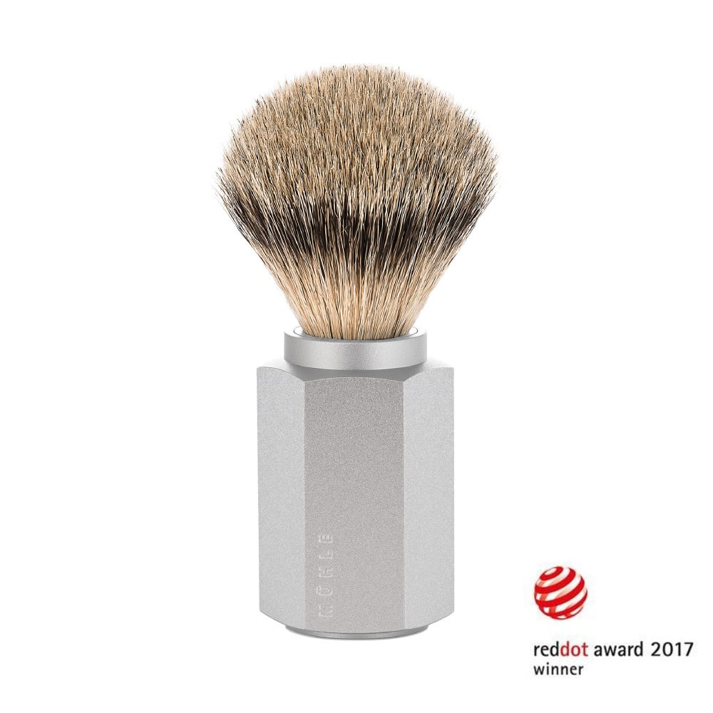 Scheerkwast met SilvertipDassenhaar uit de Hexagon serie van MÜHLE. Ringmaat is 21mm (M). Handvat is gemaakt van Zilvergrijs RVS.