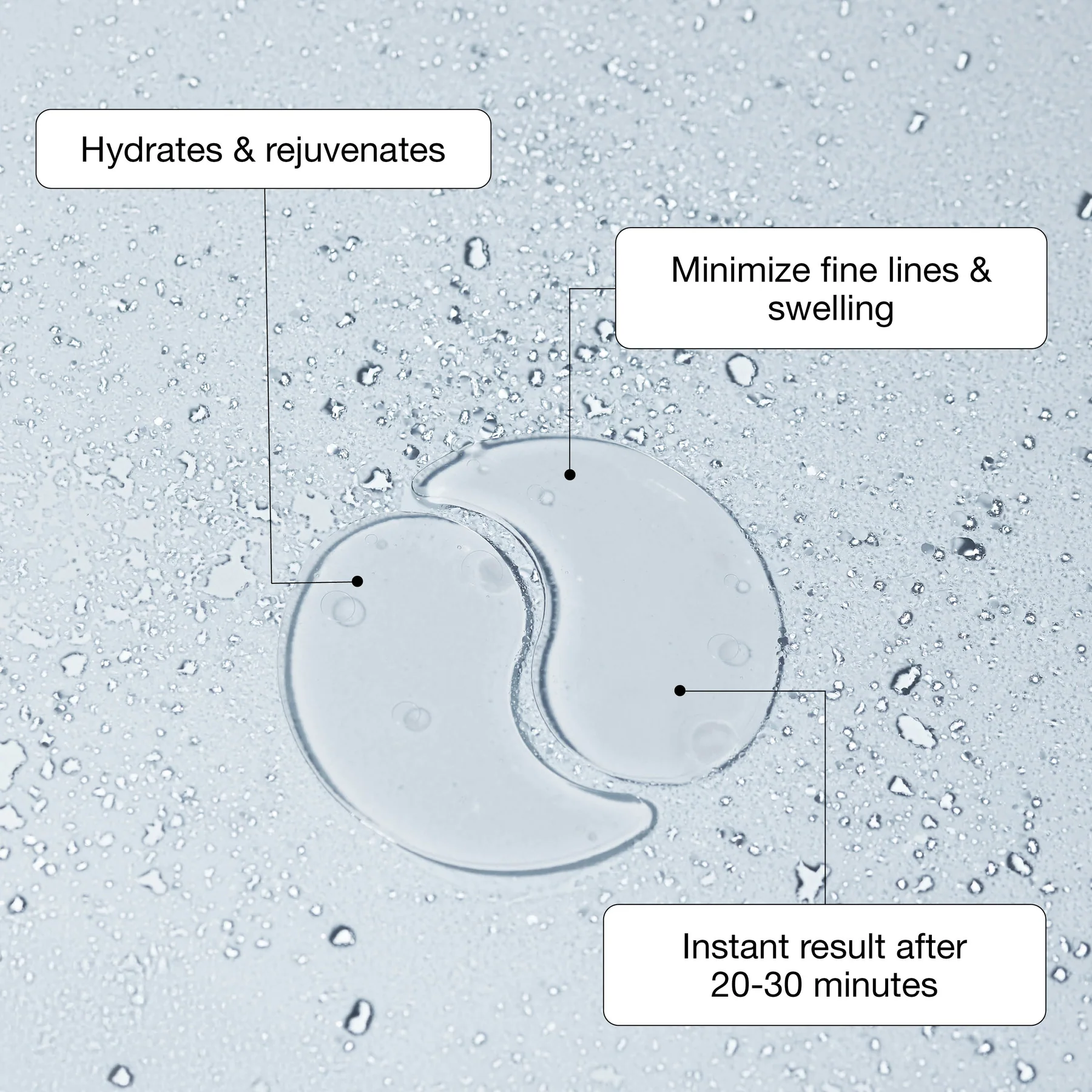 Reinig het gezicht en breng de patches aan onder de ogen. Laat 15–20 minuten inwerken en verwijder voorzichtig. Klop resterende serum zachtjes in de huid voor extra hydratatie.